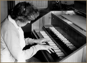 János Sebestyén's mother, Rózsi Mannaberg, trying out a new Ammer harpsichord in their home, 1967. |