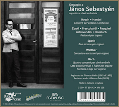 Omaggio a János Sebestyén, a 2-CD edition from Italy, features selections from the organ and harpsichord recordings made by János Sebestyén for the Angelicum label in Milan. The recently recovered master tapes, recorded by Thomas Gallia between 1963 and 1970 in Milan, Brescia, and Rovigo, have been meticulously restored for this release by Marco Taio. The program includes organ concertos by Haydn and Handel, solo organ works by Zipoli, Frescobaldi, Pasquini, Aldrovandini, Kozeluch, Speth, and Walther, concerto transcriptions for solo harpsichord by Bach, and the Eight Little Preludes and Fugues for organ traditionally ascribed to Bach. Private photos and essays found in the CD booklet recount the story behind these recordings and the decades-long friendship between János Sebestyén, Thomas Gallia, and their colleague Paul Déry. Program details and purchase information for this limited edition can be found at Discogs. A complimentary copy is also available upon request.