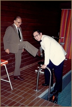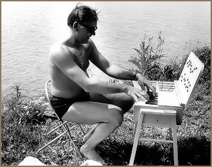 Steinway representative Paul Gerstbauer playing his water xylophone, late 1960s. |