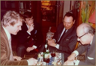 Dinner at the home of Lóránt Kovács, his wife Mária and Italian ambassador Mario Franzi, early 1980s.