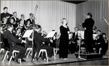 Conductor Ferenc Szekeres directing soprano Teresia Csajbók and the Budapest Madrigal Choir, early 1970s.