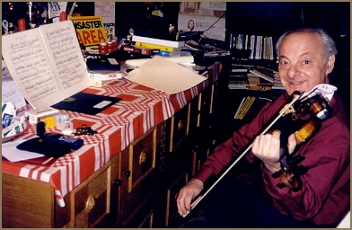 Pianist Péter Solymos, professor at the Academy of Music, and János Sebestyén, late 1990s (left); violinist György Pauk rehearsing at Sebestyén's home, mid 1990s (above).