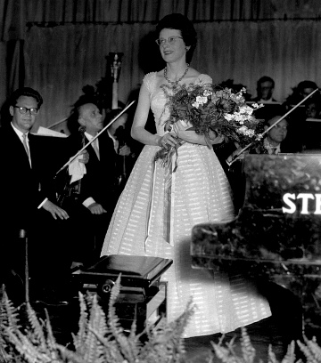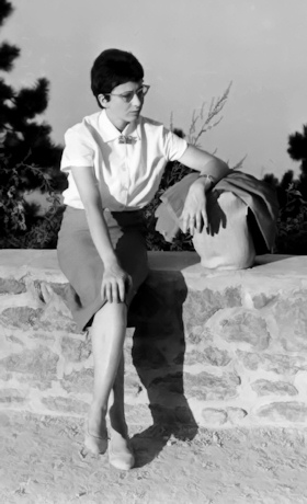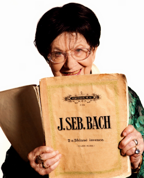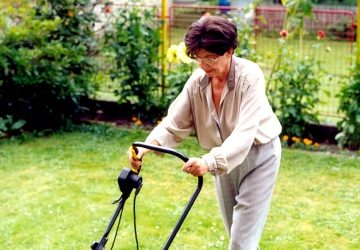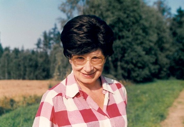 In the country, mid 1980s (top), in her garden at Jindřichův Hradec, late 1990s (middle), with one of her prize-winning dahlias, late 1990s (bottom), at Lake Balaton, 1961 (top right), after a concert, mid 1990s (bottom right).